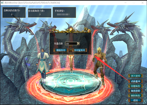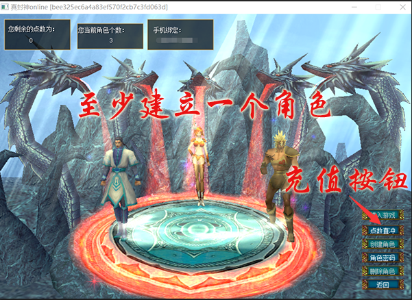 2. 具体方法:进入《周至》服选人画面,建立至少一个角色,点击充值按钮,完成充值。左上方会有充值点数显示。12月26日13时统一发放赠点,例如: 该角色原有100点,获赠20点,即实际变成120点.